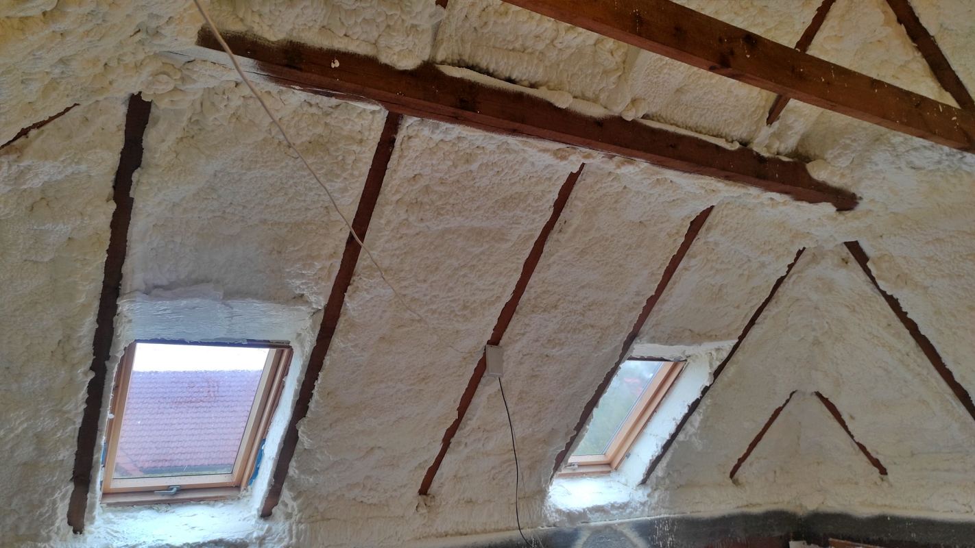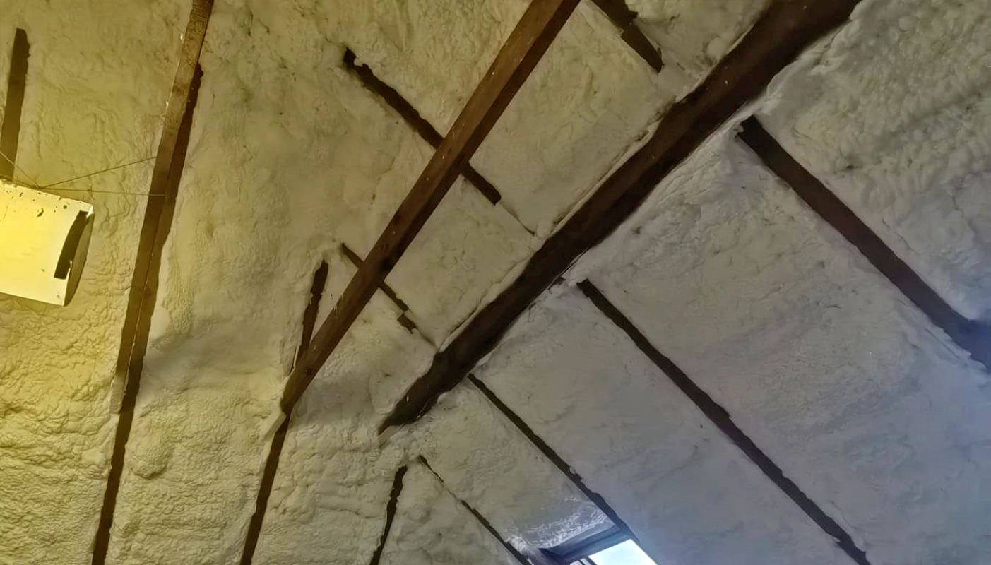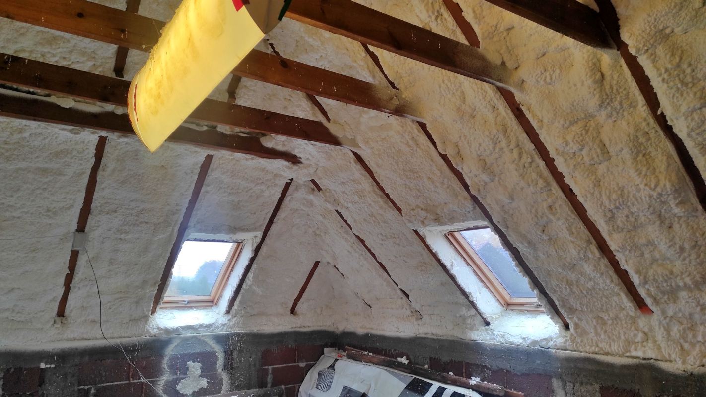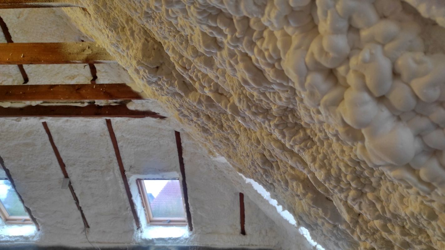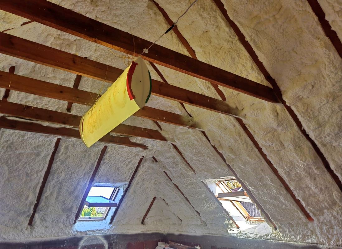 Docieplenie poddasza i zabezpieczenie przed utratą ciepła zimą jak i również przed wpływaniem gorącego powietrza latem. Wykorzystaliśmy pianę otwarto-komórkową od firmy PURECO PS06.